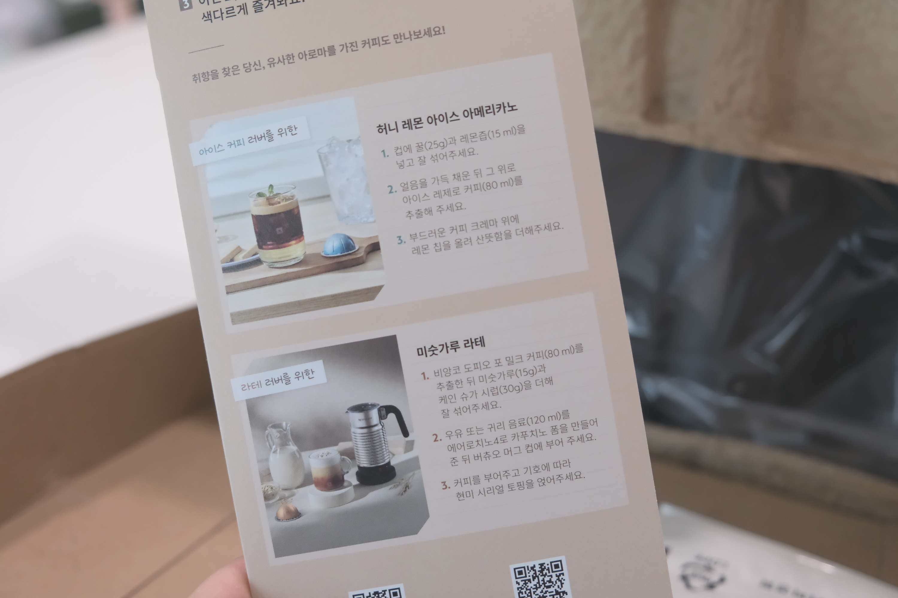 제품박스 안에는 웰컴키드 12캡슐과 사용 설명서 그리고 구매혜택들도 안내되어 있었습니다. 언박싱 후 가장 먼저 해야 하는 것은 정품등록인데요. 정품등록하면 24개월 동안 무상 AS가 가능합니다. 그리고 버츄오 커피로 만들 수 있는 레시피도 안내되어 있었습니다.